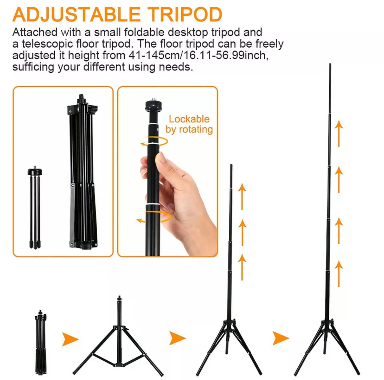 Wird mit einem kleinen faltbaren Tischstativ und einem Teleskopbodenstativ befestigt. Das Bodenstativ kann in der Höhe von 41-145 cm (16,11-56,99 Zoll) frei eingestellt werden.